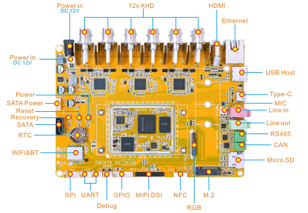 * Interfaces: 2x UART, Debug, USB2.0 Host, Type-C, MIPI DSI, HDMI, 12x AHD Camera, Micro SD, SATA, M.2, Ethernet, NFC, RS485, CAN, Line in, Line out, MIC, RTC, SPI, GPIO, etc.