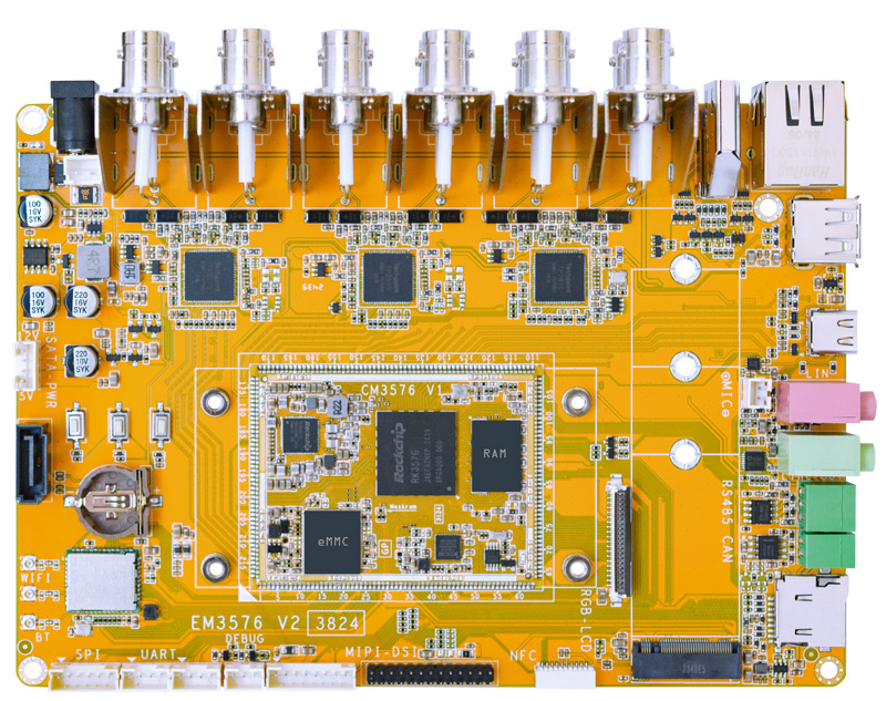 EM3576 is equipped with 4GB (up to 8GB) RAM, 32GB (up to 128GB) storage, SATA3.1/M.2/Micro SD expansion storage interface, gigabit Ethernet port and 2.4G/5G 2T2R WiFi, which can provide stable high-speed data transmission for the control center, supports connecting up to 12x AHD cameras. Combined with the built-in 6TOPS NPU, it can meet the computing power requirements of lightweight AI applications. Additionally, the independent ISP can efficiently process image content and reduce latency.