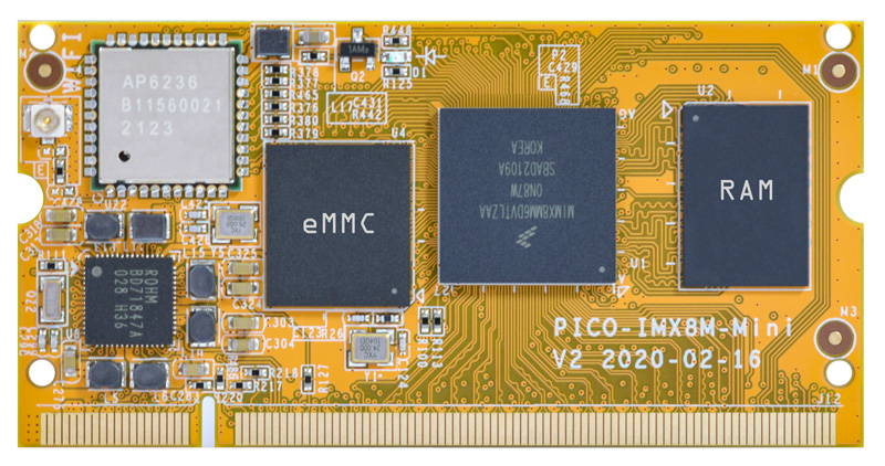 The Boardcon PICO-IMX8M-MINI is a SO-DIMM200 system on module based on NXP's quad-core, 1.8GHz i.MX8M Mini SoC. It comes with 2GB RAM and 8GB eMMC, and integrates WiFi, and BT connectivity, multiple USB and UART ports plus GPIO lines, and MIPI-DSI and MIPI-CSI display interfaces.