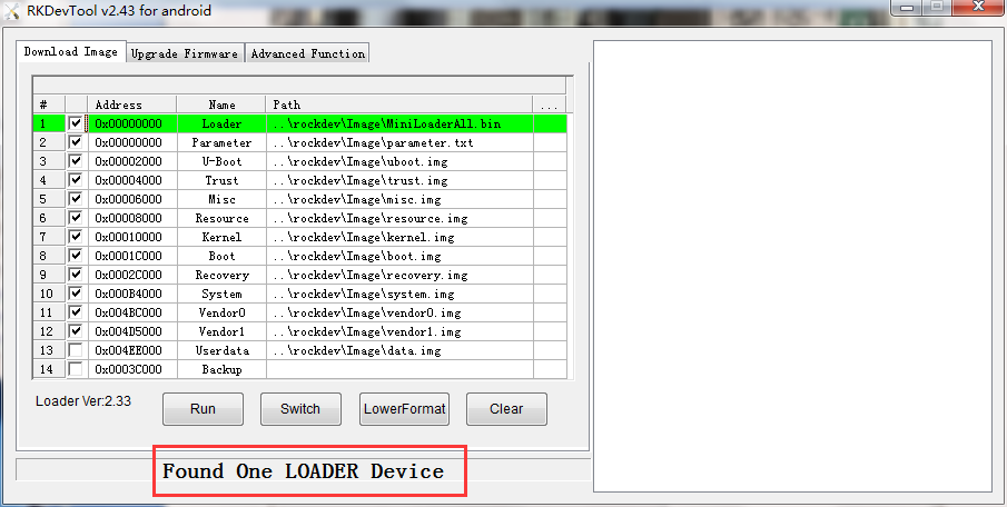 Step 2, Connect PC and development board with Micro USB cable. The windows PC will show Found One LOADER Device then release the Recovery key .